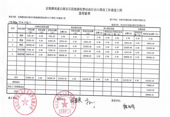 京港澳高速公路京石段健康城收費站南行出口增設工作通道工程支付證書