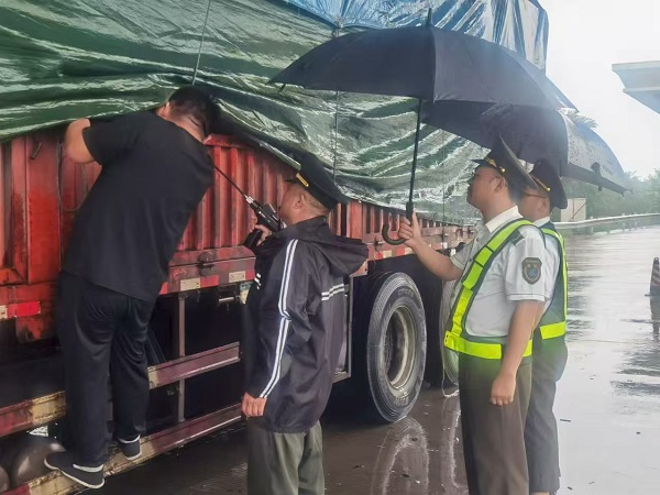 “綠通車輛車身重,雨天路滑易打滑,大家引導(dǎo)時務(wù)必站在安全區(qū)域,仔細(xì)核對證件和貨物信息!”突擊隊隊長的喊話雖被雨聲切割成碎片,卻清晰地傳到每個隊員耳中。而此時正值綠通車輛通行高峰,新鮮蔬菜、水果等物資運輸車源源不斷駛來。若因暴雨導(dǎo)致查驗效率下降,不僅會造成車道擁堵,更可能讓鮮活物資因延誤受損。突擊隊隊長一聲令下,幾名黨員迅速集結(jié),攜帶查驗工具、防滑墊、警示錐等物資,沖向雨勢最猛的收費廣場。