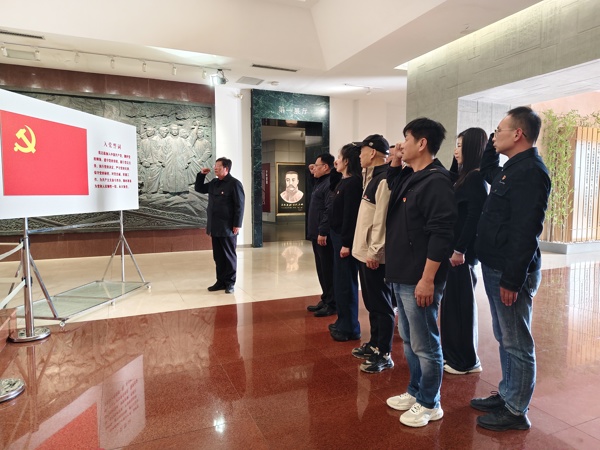 在李大釗紀(jì)念館前,全體黨員整齊列隊(duì),面向黨旗莊嚴(yán)宣誓,重溫入黨誓詞。鏗鏘誓言回蕩在廣場上空,彰顯了同志們堅(jiān)守初心、勇?lián)姑膱?jiān)定信念。