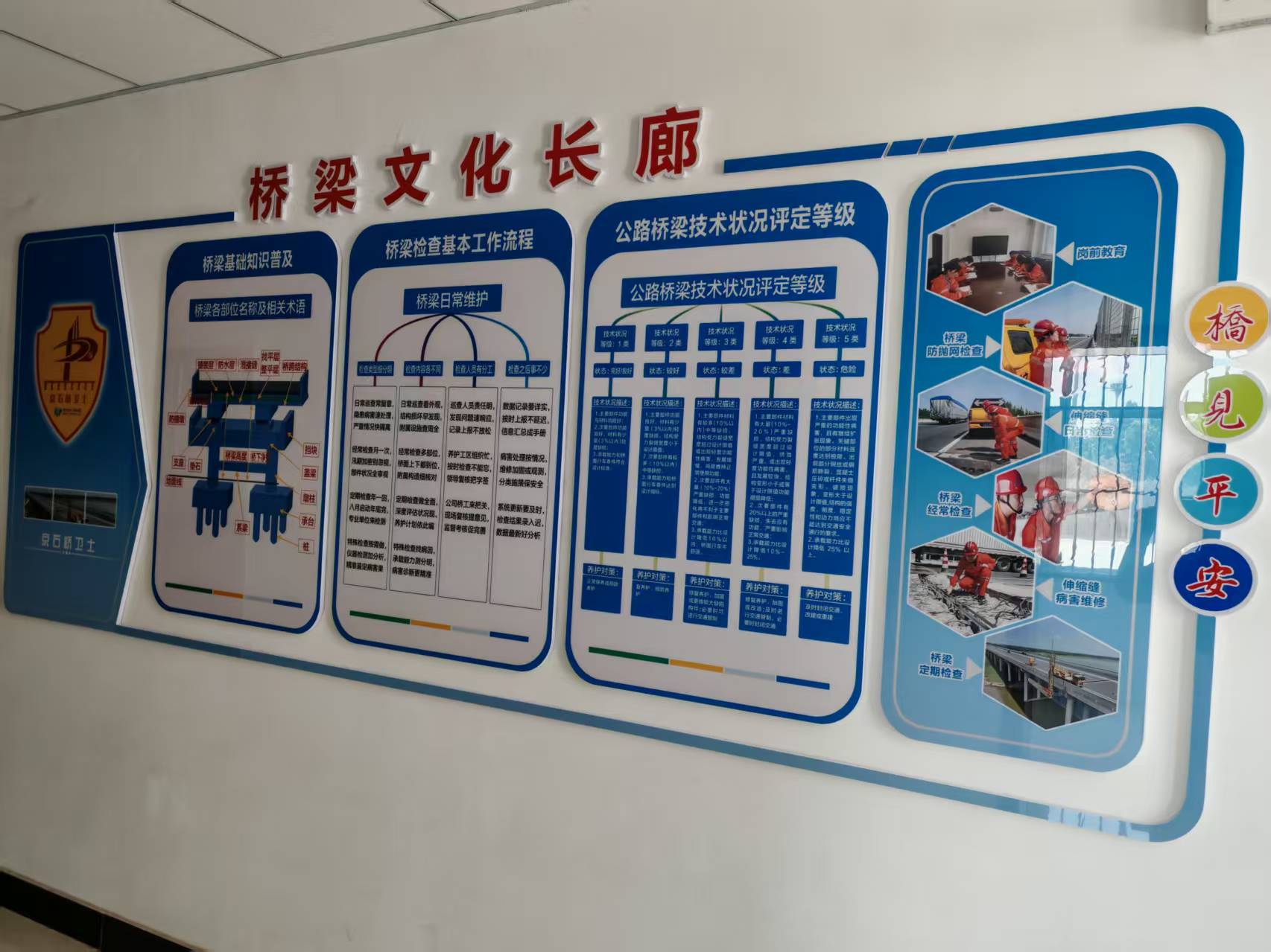 在經(jīng)歷前期室內知識科普、橋梁現(xiàn)場實際教學后,為進一步鞏固橋梁知識科普成果,橋梁科通過將橋梁各部位名稱及相關術語、橋梁檢查基本工作流程以及橋梁技術狀況評定等級等內容結合橋梁示意圖在工區(qū)辦公樓一樓走廊內進行上墻展示。