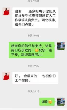 半小時后車主抵達三工區(qū),他激動地向巡查人員連聲致謝,并感慨道:“我本來沒報希望能找回來,你們的高速值班員和巡查員工作都很認(rèn)真負責(zé),讓我收到意外的驚喜,河北很棒,給你們點贊!”值班員則暖心回復(fù):“感謝您的信任與支持,這是我們應(yīng)該做的!祝您一路平安,歡迎常來河北!”