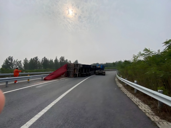 險(xiǎn)情突發(fā)之際,機(jī)電二科值班人員迅速啟動(dòng)應(yīng)急處置流程。一方面立即指揮后方來(lái)車靠邊???,另一方面對(duì)貨車司機(jī)展開(kāi)情況核查。在確認(rèn)司機(jī)身體無(wú)大礙后,二人即刻啟動(dòng)多方聯(lián)動(dòng)機(jī)制——同步聯(lián)系智慧調(diào)度監(jiān)控中心、高速交警、養(yǎng)護(hù)工區(qū)及路政大隊(duì),精準(zhǔn)上報(bào)事故具體位置、現(xiàn)場(chǎng)擁堵程度及貨物散落范圍等關(guān)鍵信息;與此同時(shí),及時(shí)通知機(jī)場(chǎng)東收費(fèi)站安排人員趕赴現(xiàn)場(chǎng),疏導(dǎo)后方積壓車輛。為防范二次事故,二人還在事故現(xiàn)場(chǎng)后方快速布設(shè)反光錐桶,劃定安全警示區(qū)域,全程堅(jiān)守現(xiàn)場(chǎng)維護(hù)交通秩序。