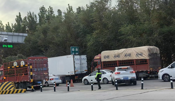下午3時(shí)30分左右,第一波繞行車流抵達(dá)站口。望都站廣場(chǎng)瞬間排起長(zhǎng)隊(duì),卻秩序井然——疏導(dǎo)人員在車道間來回穿梭,精準(zhǔn)引導(dǎo)小型客車、大型貨車分道通行;收費(fèi)員協(xié)助司機(jī)取卡、收費(fèi)等;綠通查驗(yàn)崗的人員認(rèn)真拍照留檔,額角的汗珠閃著光:“綠通車輛必須嚴(yán)查細(xì)驗(yàn),既保暢通,更不能漏放違規(guī)車!”