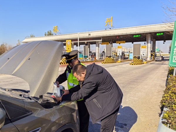 接到報告后,王松青沒有絲毫耽擱,第一時間來到故障車輛前。經初步查看和與司機溝通,確認車輛是因缺乏防凍液導致發(fā)動機“開鍋”,無法繼續(xù)行駛。面對司機焦急無奈的神情,王松青沉著安撫道:“您別著急,我們站的便民服務亭里備有常用的防凍液,我這就去給您取來?!?/p>