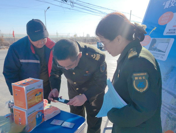 “師傅,歇腳時不妨看看這個!”工作人員手持宣傳頁,向剛停穩(wěn)的貨車司機熱情介紹“冀交萬里行”“京石易行”小程序,針對司機們關(guān)心的“操作復(fù)雜嗎?”“優(yōu)惠實在不?”等問題,團隊現(xiàn)場演示、耐心解答,把“年終沖刺”的干勁融入一句句貼心提醒里。