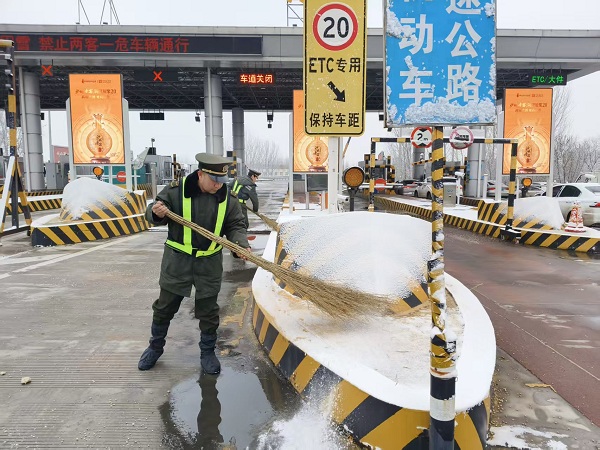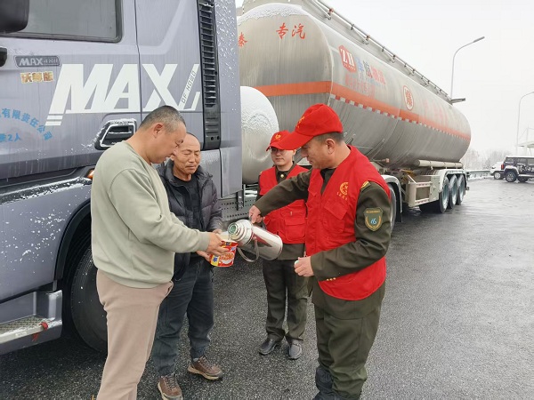 為打贏此次除雪保暢攻堅戰(zhàn),徐水站嚴(yán)格落實上級指示精神,制定了九條工作措施,全力保障道路安全通行。具體行動上,組織在站職工對收費(fèi)車道、廣場等關(guān)鍵區(qū)域撒融雪劑,從源頭上防范路面結(jié)冰及車輛追尾等安全事故,迅速組織人力投入收費(fèi)站口除雪作業(yè)。同時,徐水站在做好保暢通工作的同時做好延伸服務(wù)。將管控信息及時發(fā)布至貨車營銷群內(nèi),為過往司乘發(fā)放安全通行提示卡,安排專職人員協(xié)助300余名司乘注冊“限速通行”小程序順利通行;針對因封路滯留在收費(fèi)廣場的司乘,工作人員主動送上23桶泡面、10壺?zé)崴葢?yīng)急物資,緩解司乘的焦躁情緒。