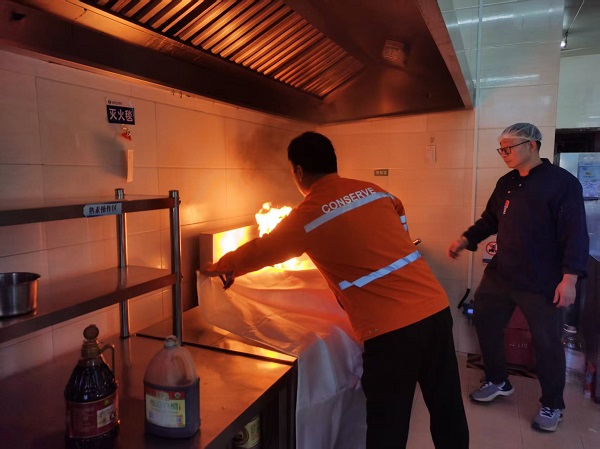 實操環(huán)節(jié)中,安全員針對三類器材的使用場景與操作要點開展精準教學。在防毒防煙面具使用模塊,重點演示了濾毒罐密封性檢查、頭帶松緊調節(jié)及氣密測試技巧,指導員工通過“負壓測試”確保佩戴合格,掌握“深慢呼吸、小步移動”的逃生要領。滅火毯實操現(xiàn)場,手把手傳授“握角抖開、上風向覆蓋、邊緣壓實”的規(guī)范動作,明確油鍋等初期火災需覆蓋15分鐘以上的處置標準,杜絕復燃風險。